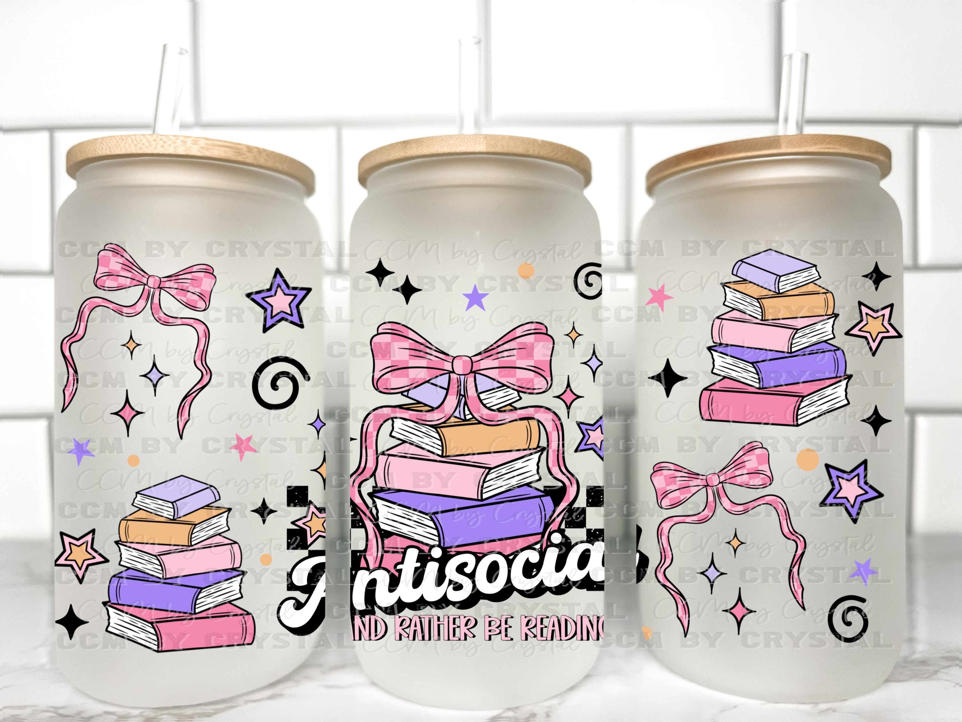 Antisocial I'd Rather Be Reading UV Transfer 16oz Libby Glass Can Wrap Ready to Apply