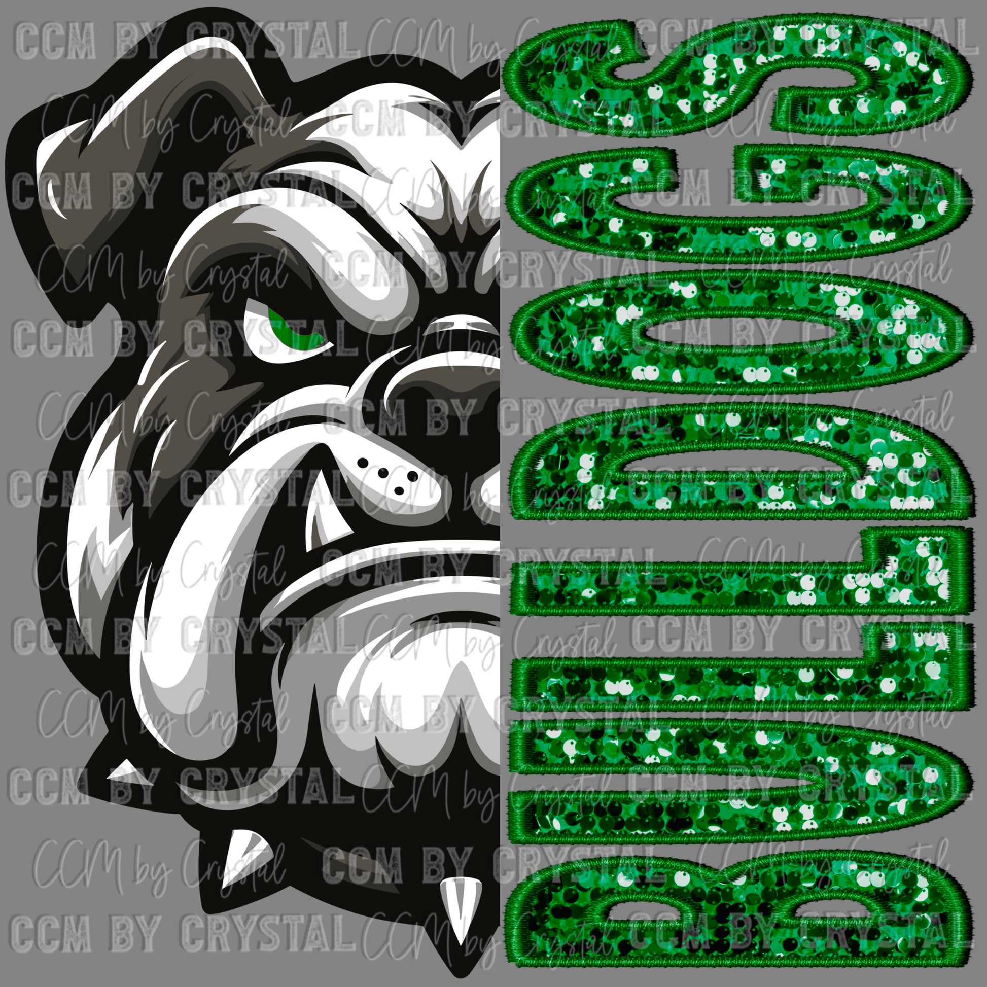 Bulldogs Green Mascot Faux Sequins Faux Embroidery Ready to Press Transfer DTF Transfer Sublimation Transfer