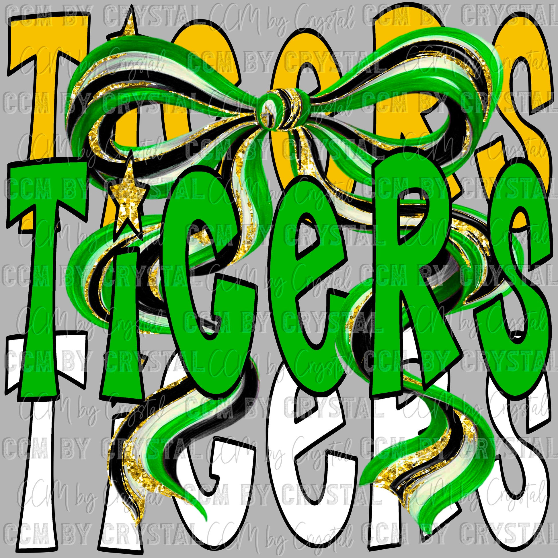 Tigers Bow Green and Yellow Gold Mascot Ready to Press Transfer DTF Transfer Sublimation Transfer